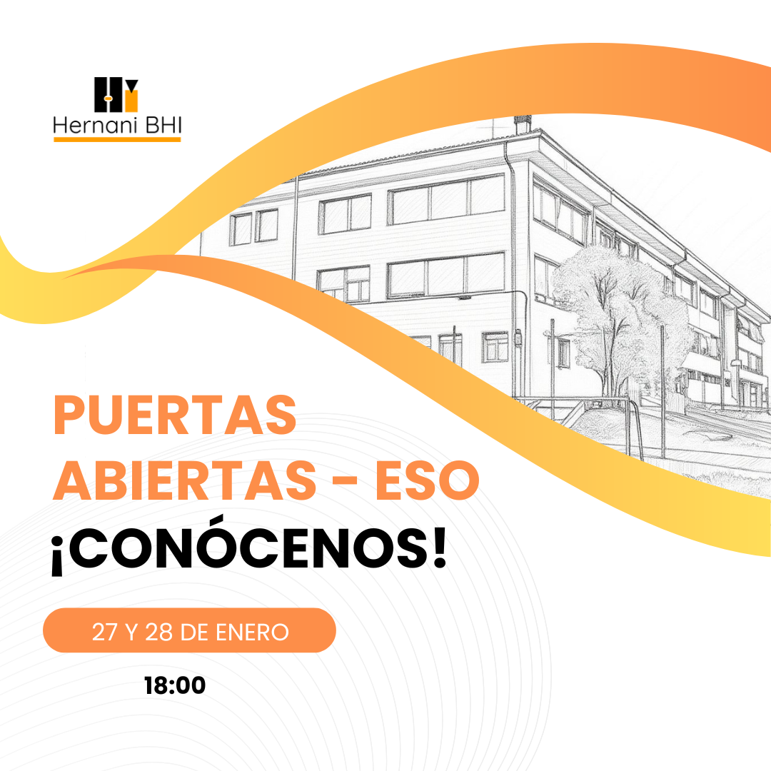 Los días 27 y 28 de enero se abren las puertas del instituto de Hernani para poder visitar sus instalaciones y conocer nuestro Proyecto Educativo. Os esperamos en el edificio de Santa Bárbara a las 18:00.